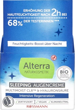Die Alterra Sleeping Augencreme ist eine reichhaltige Nachtpflege zur Regeneration der empfindlichen Augenpartie über Nacht mit nachweislich feuchtigkeitsspendender Wirkung**. Multimoist CLR™ versorgt die Haut sofort und langanhaltend mit Feuchtigkeit und glättet sie. Bei regelmäßiger Anwendung werden Trockenheitsfältchen gemildert, die Haut erscheint glatter und weicher***. Vitamin E hilft der Haut, sich besser vor negativen, oxidativen Umwelteinflüssen zu schützen.