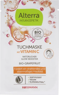 Unsere Alterra Tuchmaske mit antioxidativem Vitamin C, Bio-Grapefruit und Bio-Trauben- kernextrakt vereint feuchtigkeitsspendende und vitalisierende Eigenschften.
