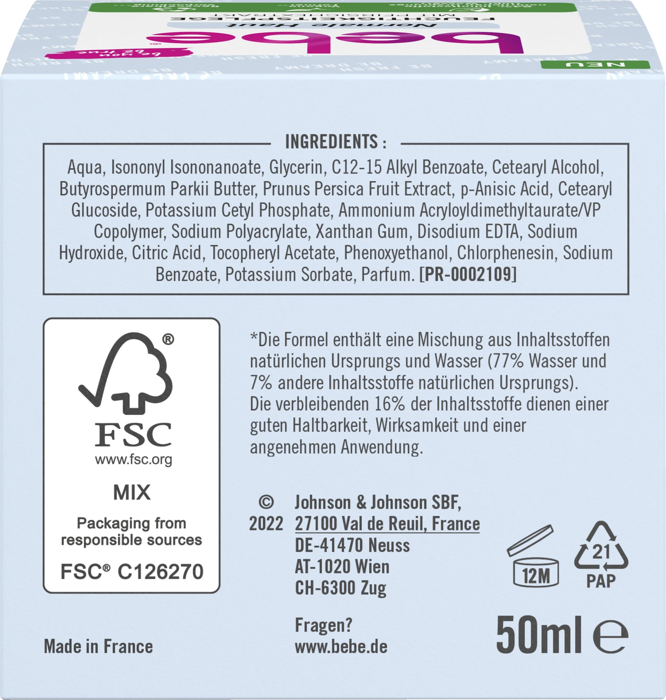 Aqua, Isononyl Isononanoate, Glycerin, C12-15 Alkyl Benzoate, Cetearyl Alcohol, Butyrospermum Parkii Butter, Prunus Persica Fruit Extract, p-Anisic Acid, Cetearyl Glucoside, Potassium Cetyl Phosphate, Ammonium Acryloyldimethyltaurate/VP Copolymer, Sodium Polyacrylate, Xanthan Gum, Disodium EDTA, Sodium Hydroxide, Citric Acid, Tocopheryl Acetate, Phenoxyethanol, Chlorphenesin, Sodium Benzoate, Potassium Sorbate, Parfum