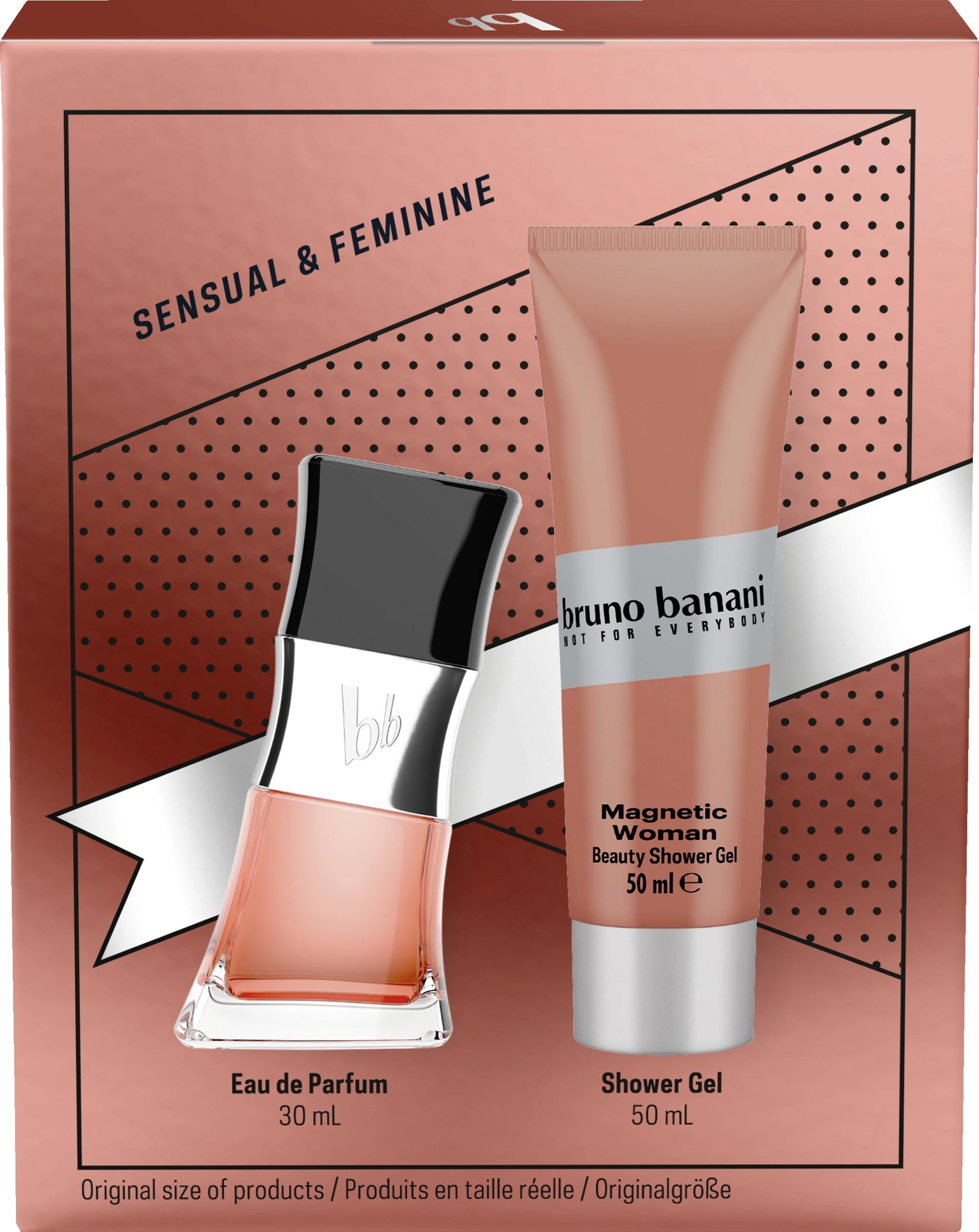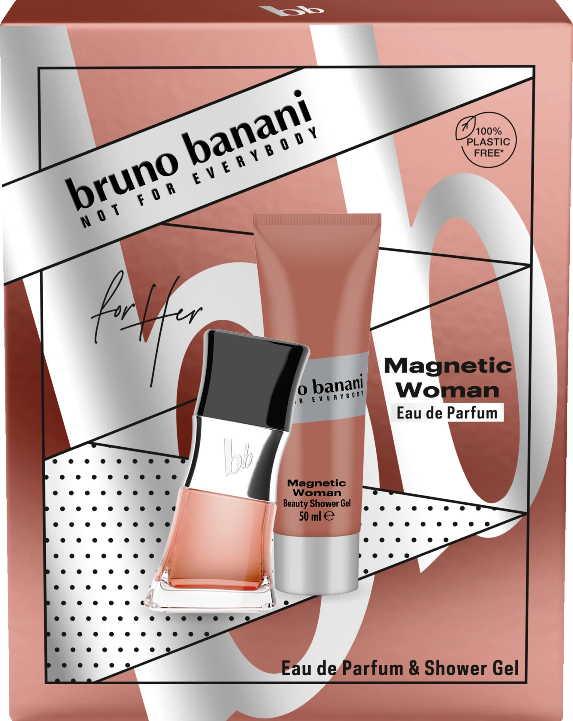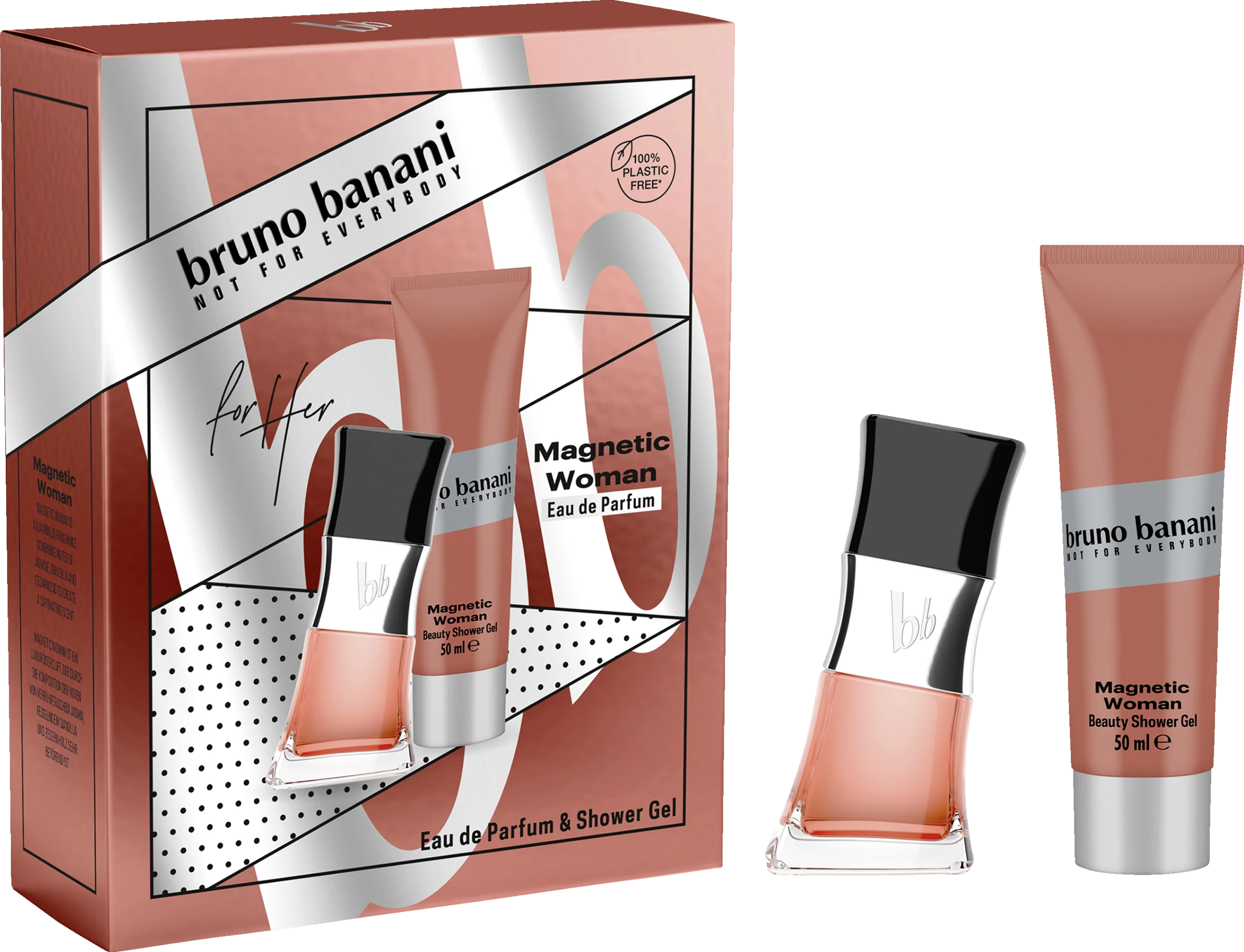 Dieses Geschenkset enthält ein Magnetic Woman Eau de Parfum 30ml und ein dazu passendes Duschgel mit 50ml: bruno banani Magnetic Woman ist der Duft für Frauen, die sich nicht verstecken: Vielschichtig, glamourös und einzigartig. Die exotische Duftkomposition aus spritziger Fruchtigkeit und süßer Verführung, gebettet auf warm-würzigen Aromen wirkt anziehend wie ein Magnet – wie ein süßes Lächeln, das ein Feuerwerk der Leidenschaft entfacht. Oriental-Floral: Magnetic Woman lockt mit einer Kopfnote aus frischen Zitrusfrüchten, fruchtiger Birne und schwarzer Johannisbeere. Im Herzen zeigt es sich durch Jasmin, Gianduja und Kakao blumig, süß und vollmundig. Getragen wird der Duft von warmer Zeder, Operanid und weichem Casheran. bruno banani Magnetic Woman Eau de Toilette bietet ein langanhaltendes Dufterlebnis für jeden Tag. Das Flakon-Design zeigt sich in der für bruno banani typischen asymmetrischen Form – für die Diva mit dem Augenzwinkern.Das Geschenkset besteht aus: Eau de Toilette 30ml und Duschgel 50ml.