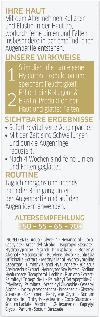 Täglich morgens und abends nach der Reinigung unter der Augenpartie und auf den Augenlidern anwenden.