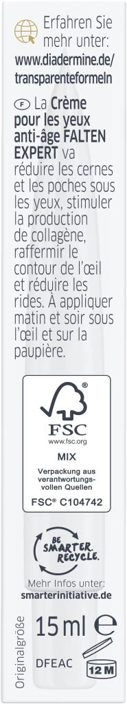 Mit dem Alter nehmen Kollagen und Elastin in der Haut ab, wodurch feine Linien und Falten insbesondere in der empfindlichen Augenpartie entstehen. DIADERMINE Age Supreme Falten Expert 3D Anti-Age Augencreme für reife Haut mit Hyaluron-aktivierenden Peptiden korrigiert Faltentiefe & -oberfläche.