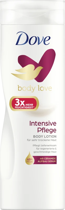 Dove Body Love Intensive Pflege Body Lotion hilft mit ihrer schnell einziehenden Formel, sehr trockene Haut tiefenwirksam zu regenerieren und zu pflegen. Das ist besonders für diesen Hauttyp wichtig, denn die Pflege besonders trockener Haut kann schwierig sein. Die Körperlotion für sehr trockene Haut enthält das Ceramide Aufbau Serum. Dies ist eine einzigartige Kombination aus Inhaltsstoffen, die der Haut helfen, essenzielle Ceramide zu bilden, um die Hautbarriere zu stärken und ihre natürliche Feuchtigkeit zu bewahren. Dazu ist die Bodylotion dermatologisch getestet und für die tägliche Pflege geeignet. Die reichhaltige, cremige Formel zieht schnell ein und spendet bis zu 48 Stunden lang Feuchtigkeit – für geschmeidige Haut, die sich regeneriert anfühlt. Die reichhaltige Creme für sehr trockene Haut mit kreisenden Bewegungen bis in die Fingerspitzen einmassieren. Von den Füßen aufwärts auftragen, um sofort weiche, strahlende Haut zu erhalten. Raue Hautpartien freuen sich über eine Extraportion Dove Intensive Pflege Body Lotion. Wenn die Body Lotion vor dem Schlafengehen aufgetragen wird, hat die trockene Haut mehr Zeit Nährstoffe aufzunehmen. Dove ist von PETA zertifiziert und die Dove Hautpflegeprodukte tragen das PETA-approved Logo. Wir glauben bei Dove an Body Love. Unserem Körper können wir mit der richtigen Pflege jederzeit ein wenig Liebe schenken, unabhängig davon wie wir uns in unserer Haut fühlen. Dove unterstützt Frauen dabei, das volle Potenzial ihrer individuellen Schönheit zu entfalten. Wir entwickeln Produkte, die auf die speziellen Bedürfnisse von Haut und Haar eingehen. Denn der Grundsatz von Dove ist, nur wer sich durch die richtige Pflege schön und wohl in seiner Haut fühlt, kann dies auch ausstrahlen.
