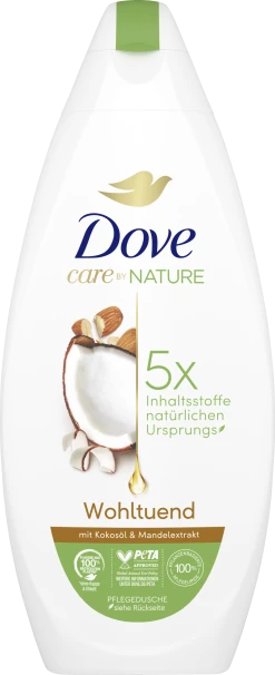 Dove Care by Nature Duschgel Wohltuend duftet süßlich-exotisch nach Kokosöl und Mandelextrakt. Die Formel mit 5 Inhaltsstoffen natürlichen Ursprungs spendet der Haut Feuchtigkeit und schützt sie so vor dem Austrocknen.