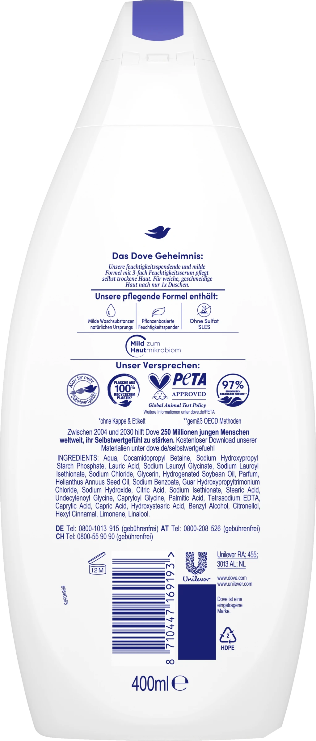 Dove Duschgel Reichhaltige Pflege sorgt für spürbar weichere Haut schon nach der ersten Dusche. Denn wer freut sich nicht über weiche Haut? Wir alle möchten, dass unsere Haut Tag für Tag gesund und gepflegt aussieht, und mit der richtigen Pflegedusche lässt sich das ganz einfach in die Tat umsetzen. Der beste Weg, sich wohl in seiner Haut zu fühlen, besteht darin, sie gleich am Morgen mit der richtigen Pflege zu versorgen. Genau aus diesem Grund haben sie die Dove Pflegedusche Reichhaltige Pflege entwickelt.