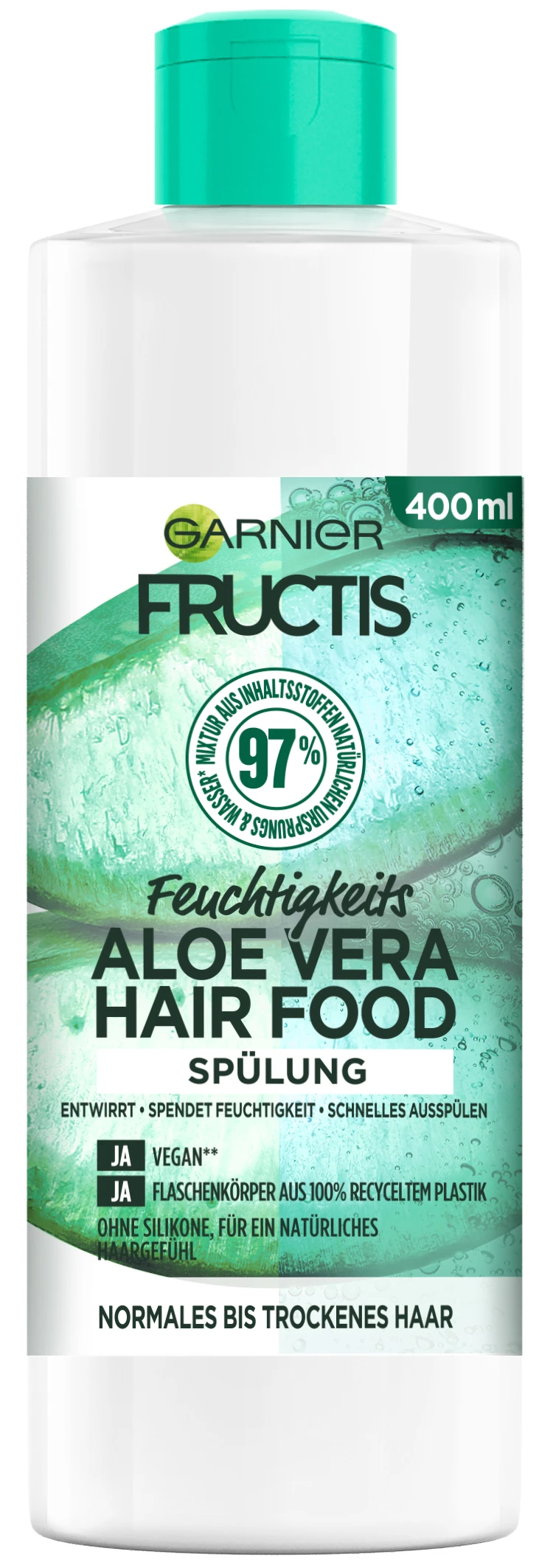 Die Fructis Feuchtigkeits Aloe Vera Hair Food Spülung versorgt trockenes Haar effektiv mit Feuchtigkeit. Dank der Mixtur aus 97% Inhaltsstoffen natürlichen Ursprungs ist die Haarkur besonders schonend zur Umwelt. Die zartschmelzende Textur zieht sofort ein und entwirrt die Haare. Die vegane Formel mit Kokosnussöl wurde ohne den Einsatz von Tierversuchen entwickelt und enthält keine Inhaltsstoffe tierischen Ursprungs. Da auf Silikone verzichtet wird, wird das Haar nicht beschwert – für ein angenehmes Haargefühl und gesund aussehende Haare. Dermatologisch getestet.