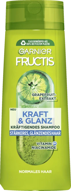 Stumpfes, glanzloses Haar? Garnier Fructis Kraft und Glanz Kräftigendes Shampoo ist die perfekte Lösung dafür. Es gibt dem Haar seine Kraft und Energie zurück und bringt es zum Glänzen. Eine besondere Kombination aus Grapefruit-Extrakt, Vitaminen B3 und B6 sowie Zitronenprotein sorgt dabei für gesund aussehendes, stärkeres Haar. Nach der Haarwäsche ist das Haar kraftvoll und frisch, mit einem wunderschönen Glanz. Die sanfte Formel eignet sich hervorragend für die tägliche Anwendung.