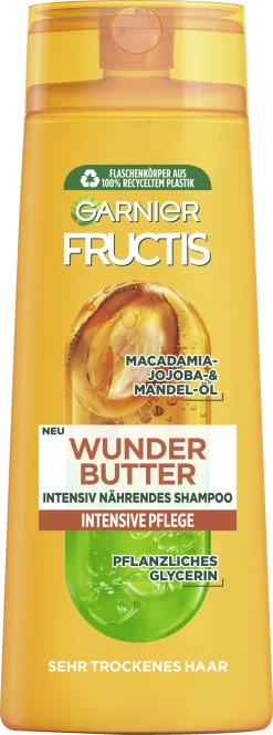 Das Fructis Oil Repair 3 Wunder Butter Kräftigendes Shampoo bietet sehr trockenem und strapaziertem Haar eine intensive Pflege. Die reichhaltige Formel kombiniert pflegende Sheabutter mit 3 reichhaltigen Ölen aus Macadamia, Jojoba und Mandeln mit Triglyceriden. Diese wirkungsvolle Kombination schützt das Haar, pflegt es intensiv und macht es geschmeidiger, ohne zu beschweren und ohne zu fetten. Das Haar ist dank Fructis Oil Repair 3 Wunder Butter Kräftigendes Shampoo langanhaltend gepflegt, riecht wunderbar und erstrahlt in wundervollem Glanz.