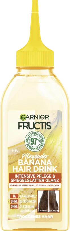 Der Garnier Fructis Bananen Hair Drink ist ein reichhaltiges Haarfluid, welches speziell auf die Bedürfnisse von trockenem Haar abgestimmt wurde. Die Formel mit Inhaltsstoffen natürlichen Ursprungs, wie Banane und Kokosnuss-Öl, enthält winzig kleine Lamellen, die sich in die Risse auf der Haaroberfläche legen, um die Haare weich zu pflegen. Dabei bietet das Express Lamellar Haarfluid sowohl eine intensive Pflege, als auch einen wunderschönen Glanz – ohne zu beschweren. Gleichzeitig fördert die Formel ein natürliches Haargefühl.