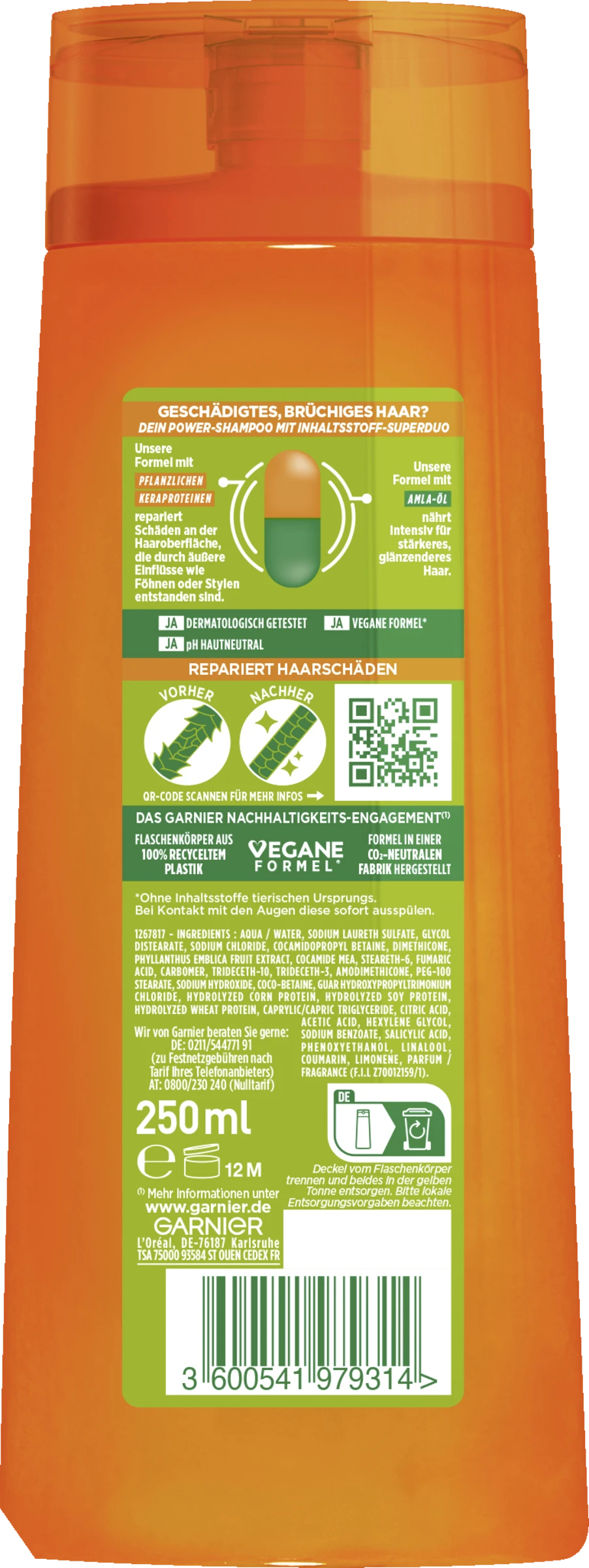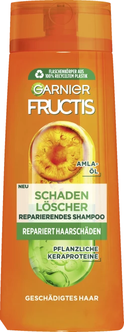 Stark geschädigtes Haar braucht intensive Pflege. Genau das bietet Garnier Fructis Schaden Löscher Kräftigendes Shampoo. Es vereint Amla-Öl und reparierendes Keraphyll, um selbst kleinste Haarschäden an der Haaroberfläche zu reparieren, die durch externe Einflüsse (z.B. Glätten, Föhnen, Färben) entstehen können. Gleichzeitig wird das Haar vor weiteren Schäden geschützt: Die Formel dringt tief in die Haarfaser ein und füllt Risse im Haar auf – die Haaroberfläche wird versiegelt und somit widerstandsfähiger. Das Ergebnis: Das Haar ist wunderbar glänzend und geschmeidig, hat weniger Spliss und die Längen sind kräftiger.