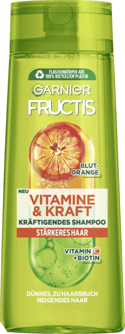 Das Garnier Fructis Vitamine & Kraft Kräftigendes Shampoo eignet sich insbesondere für die Anwendung bei dünnem, zu Haarbruch neigendem Haar. Mit der vitaminreichen Kombination aus der Superfruit Blutorange sowie den tiefenwirsamen Inhaltsstoffen Vitamin C Derivat und Biotin wird der Haarfaser spezielle Kraft verliehen. Die Haare werden gestärkt und erscheinen kraftvoller – vom Ansatz bis in die Spitzen. Zudem wird Haarverlust dank Anti-Haarbruch-Effekt beim Kämmen vorgebeugt und somit das Haar beim Kämmen geschützt. So erscheint das Haar sichtbar kräftiger und glänzender. Zudem wurde das Shampoo dermatologisch getestet und ist auch für empfindliche Haartypen geeignet.