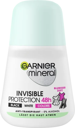 Der Garnier Mineral Invisible Black, White & Colors Roll-on sorgt für einen 48 Stunden-Deo-Schutz und verhindert, dass sich Deo-Flecken auf der Kleidung absetzen. Gleichzeitig bietet das Anti-Transpirant einen intensiven Schutz vor Achselnässe und Körpergeruch – bis zu 48 Stunden lang. Die Formel des Roll-ons ist mit Mineralite* angereichert. So entsteht ein sehr langanhaltender und starker Trocken-Effekt – für ein frisches, sauberes Hautgefühl. Garnier Mineral Invisible Black, White & Colors Roll-on klebt nicht und fühlt sich dank der leichten Emulsion angenehm auf der Haut an.