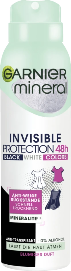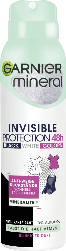 Das Garnier Mineral Invisible Black, White Colors Spray sorgt für einen 48 h-Deo-Schutz und verhindert, dass sich Deo-Flecken auf der Kleidung absetzen. Gleichzeitig bietet das Anti-Transpirant einen intensiven Schutz vor Achselnässe und Körpergeruch – bis zu 48 Stunden lang. Die Formel des Sprays ist mit Mineralite* angereichert. So entsteht ein sehr langanhaltender und starker Trocken-Effekt – für ein frisches, sauberes Hautgefühl. Garnier Mineral Invisible Black, White Colors Spray klebt nicht und fühlt sich dank der erfrischenden, feinen Textur angenehm auf der Haut an.