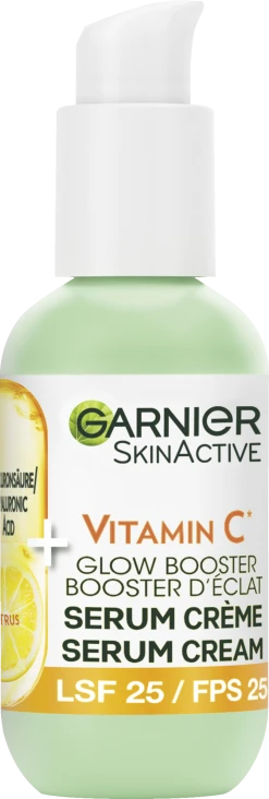 Die Garnier SkinActive Vitamin C Serum Crème verbindet die Eigenschaften einer feuchtigkeitsspendenden Creme mit der speziellen Wirksamkeit eines Serums. Die Tagespflege mit LSF 25 enthält eine leichte Formel, die mit wertvollem Vitamin C angereichert ist und ein strahlenderes Hautbild fördert. Die Serum-Creme eignet sich perfekt zur Milderung von Müdigkeitsanzeichen sowie dunklen Flecken auf der Gesichtshaut. Super Zitrus verleiht der Haut mehr Ebenmäßigkeit und Strahlkraft. Die Haut erscheint weniger matt – für sichtbar frischere Haut und einen boostenden Glow-Effekt.