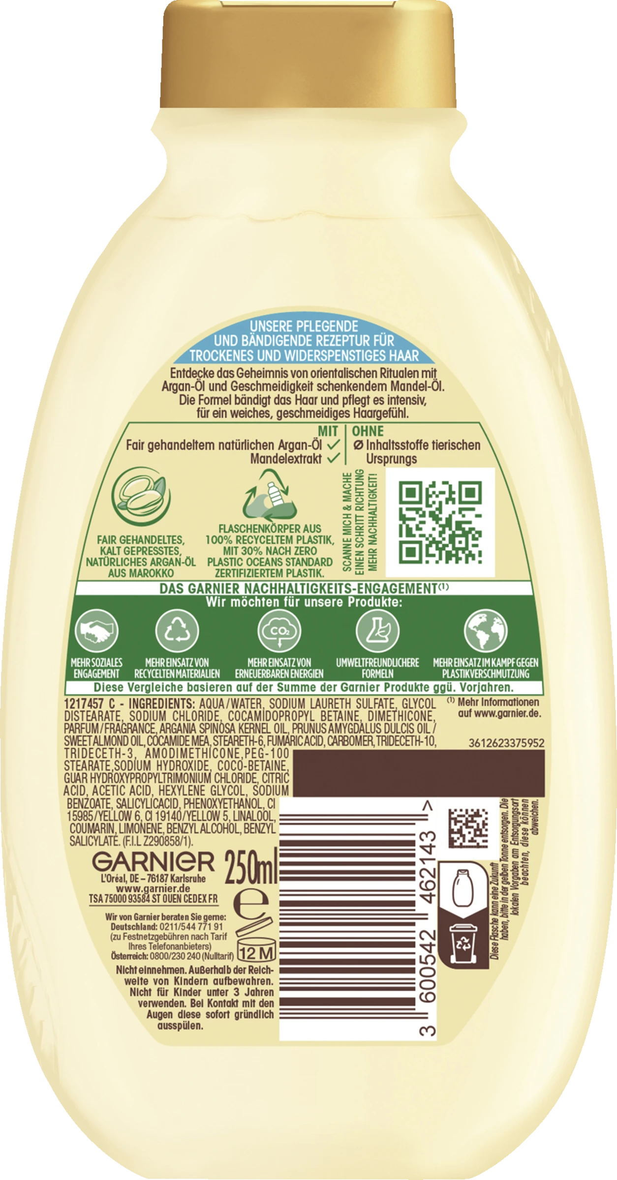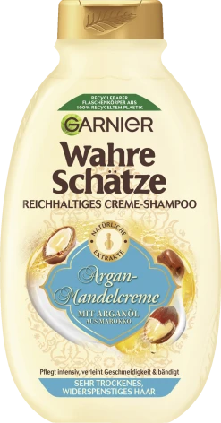 Garnier Wahre Schätze Reichhaltiges Creme-Shampoo Argan-Mandelcreme pflegt; schützt und bändigt sehr trockenes; widerspenstiges Haar und verleiht ihm Geschmeidigkeit. Dank Argan-Öl wird das Haar tiefenwirksam gepflegt und geschützt. Das natürliche Öl aus Marokko wurde fair gehandelt. Die reichhaltige Creme sorgt für ein weiches, geschmeidiges Haargefühl, das Haar strahlt voller natürlicher Schönheit.