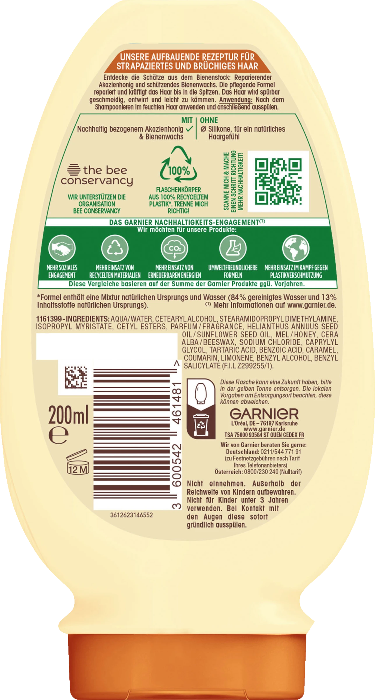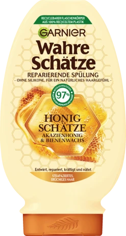 Strapaziertes, brüchiges Haar adé – Garnier Wahre Schätze Reparierende Spülung Honig Schätze vereint die Kraft von Schätzen aus dem Bienenstock, um das geschädigte Haar zu reparieren und wieder aufzubauen. Sowohl der reparierende Akazienhonig als auch das schützende Bienenwachs sind nachhaltig bezogen. Repariert und gekräftigt bis in die Spitzen wird das Haar spürbar geschmeidig, entwirrt und leicht zu kämmen. Bonus: der wunderbare Honigduft.