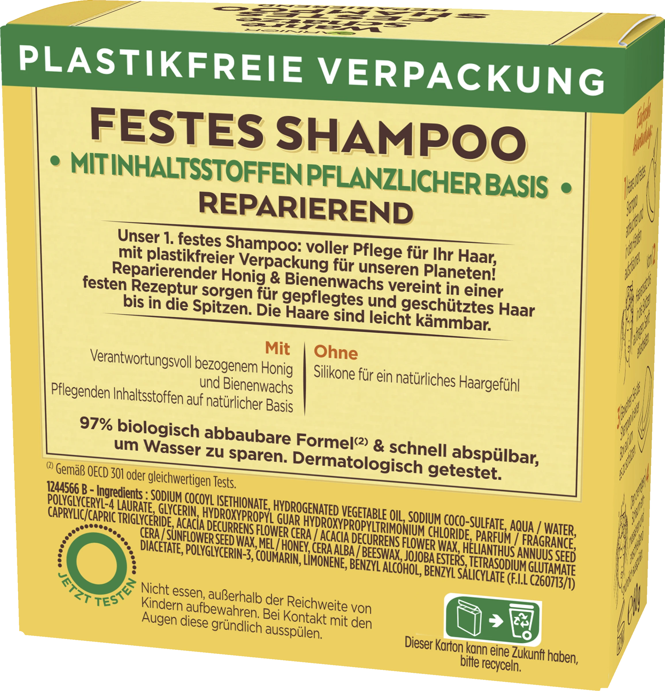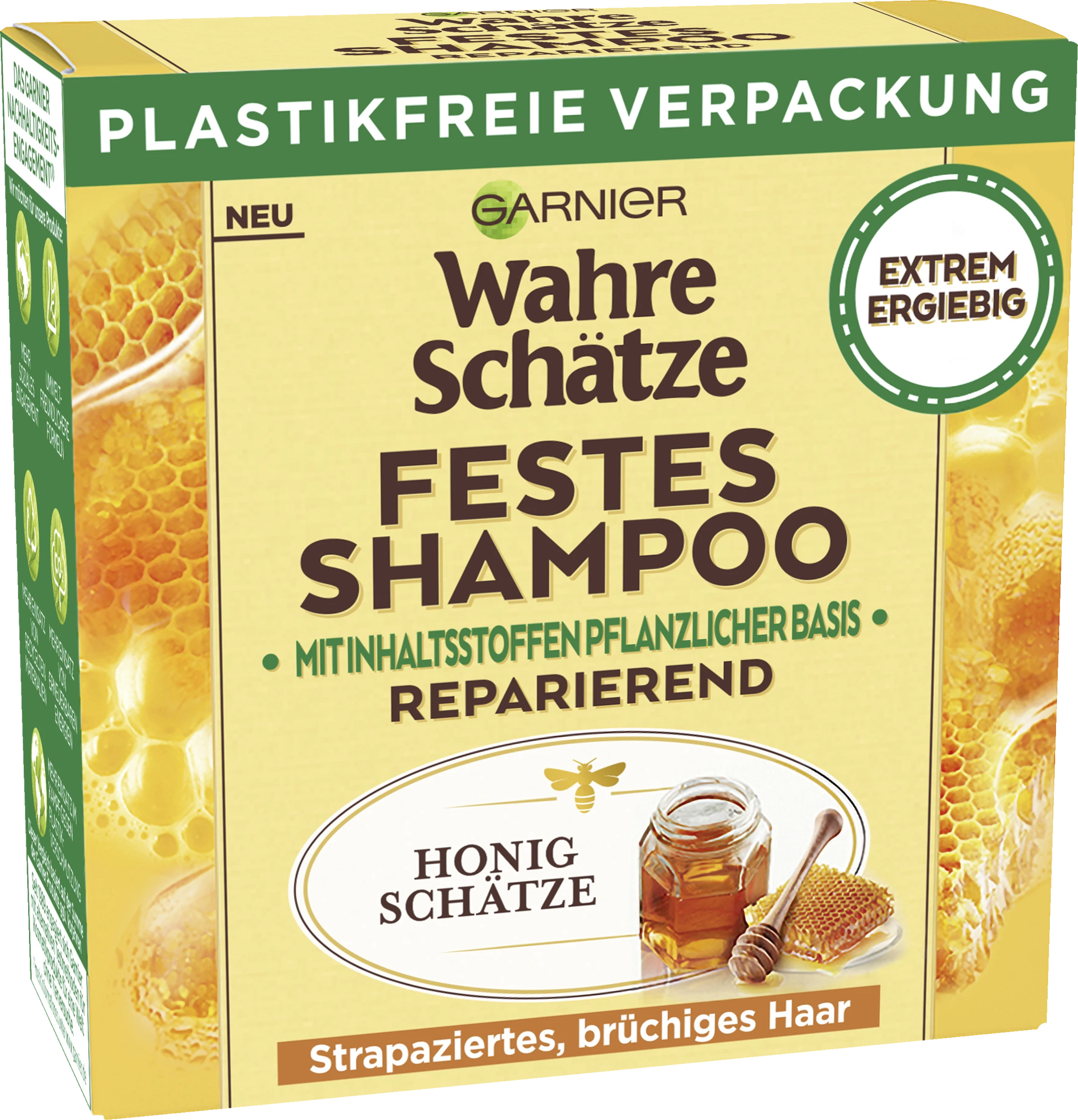 Mit dem Garnier Wahre Schätze Festes Shampoo Honig Schätze werden die Haare intensiv gepflegt. Die feste Rezeptur des Shampoos vereint Honig und Bienenwachs, welche dem Haar Kraft und Geschmeidigkeit schenkt. Dank der Inhaltsstoffe auf pflanzlicher Basis repariert die Formel geschädigtes Haar und baut es wieder auf. Bienenwachs schützt die Haare und Honig lässt sie sanfter wirken. Dadurch schenkt das Honig-Shampoo den Haaren ein unvergleichliches Strahlen. Die Textur ist zu 97 % biologisch abbaubar und beschwert das Haar nicht. Es sorgt für leichte Kämmbarkeit – für ein besonders intensives Pflegeerlebis.