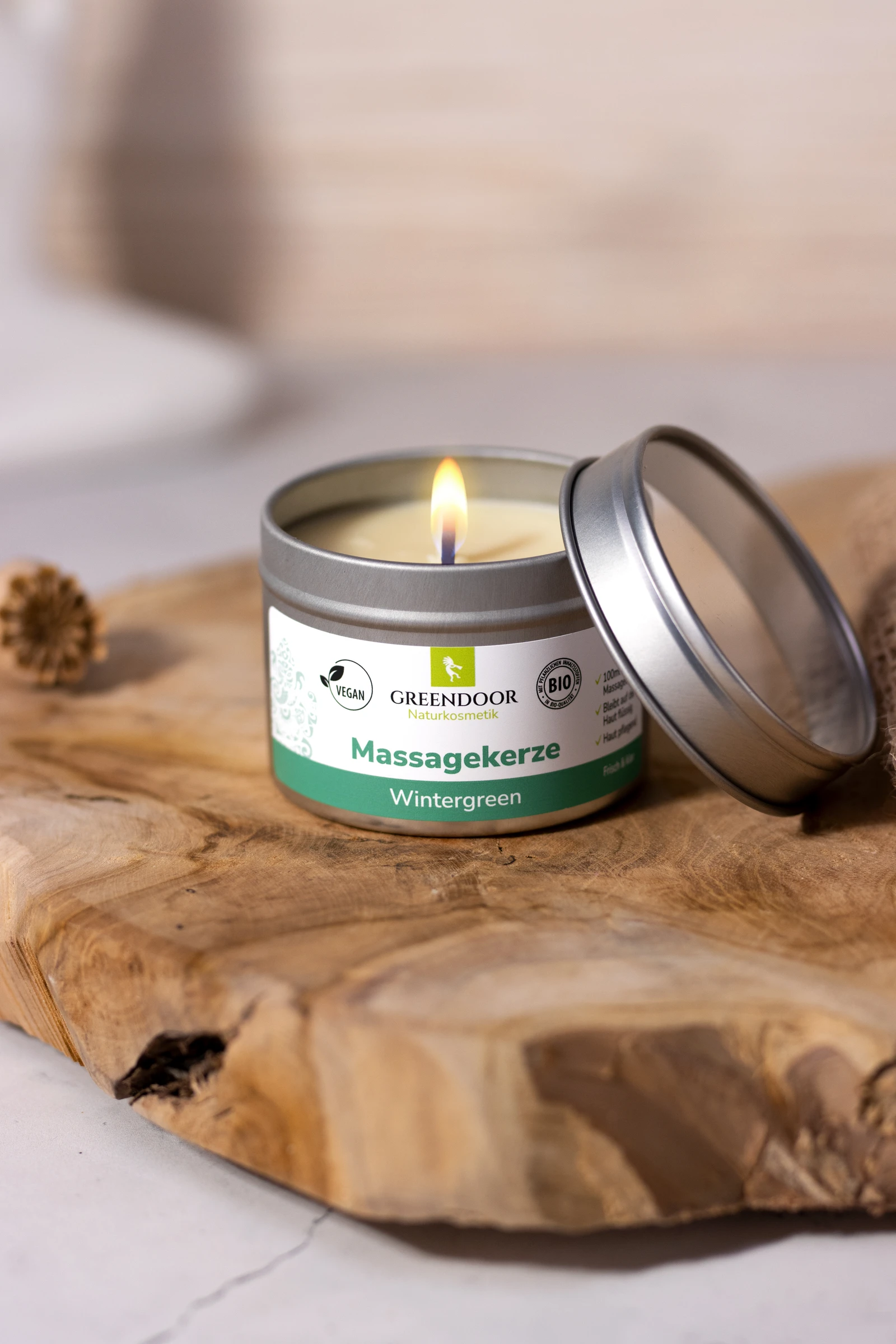 Mit dem warmen Wachs der GREENDOOR Massagekerze Wintergreen zum außergewöhnlichen Massageerlebnis dank der wertvollen Öle und dem natürlichen Greendoor Rezepturgeheimnis. Nach 10-15 Minuten Zeit ist genug Wachs für eine Massage geschmolzen. Kerze löschen und das flüssige Wachs in die Handfläche gießen. Das Wachs einer GREENDOOR Massagekerze ist nur so warm, wie ein heißes Bad. Los geht’s mit der Massage! Das natürliche GREENDOOR Rezepturgeheimnis sorgt dafür, dass das entstehende Massageöl auf der Haut nicht mehr fest wird und bei der Massage in die Haut einzieht. Ätherisches Öl Wintergreen und Pfefferminze, dringen tief in die Haut ein und fördern die Durchblutung der Muskulatur. Die Anwendung von warmen Ölen bei der Massage entspannt verhärtete Muskelpartien besonders gut
