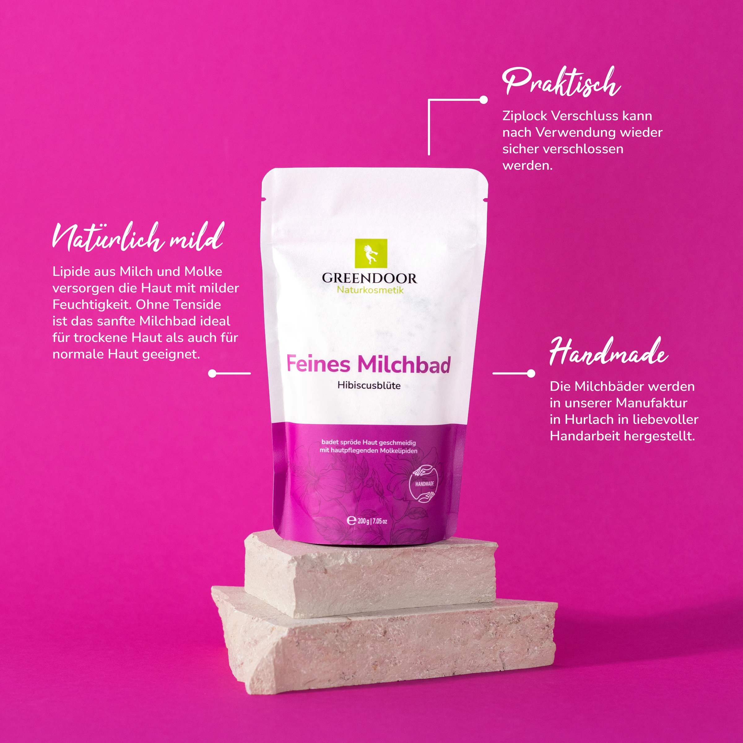 Das Greendoor Milchbad Hibiscusblüte: edle Hibiscusblüten umschmeicheln die Haut; Milch, Molke und französisches Meersalz machen Sie zart und weich. Der feine, blumige Duft verleiht dem Milchbad einen besonderen Genuß. So können Sie entspannen und Ihre Haut wird dabei von dem feinen Milchbad Hibiscusblüte sanft gepflegt. Greendoor feines Milchbad enthält Milch und proteinreiche Molke die besonders sanft und pflegend zur Haut sind. Es hat eine enorm ausgleichende Wirkung und sorgt für wirklich natürlich gepflegte samtige Haut. Das Milchbad ist frei von reizenden Tensiden und enthält keine Schaumbildner oder Farbstoffe.