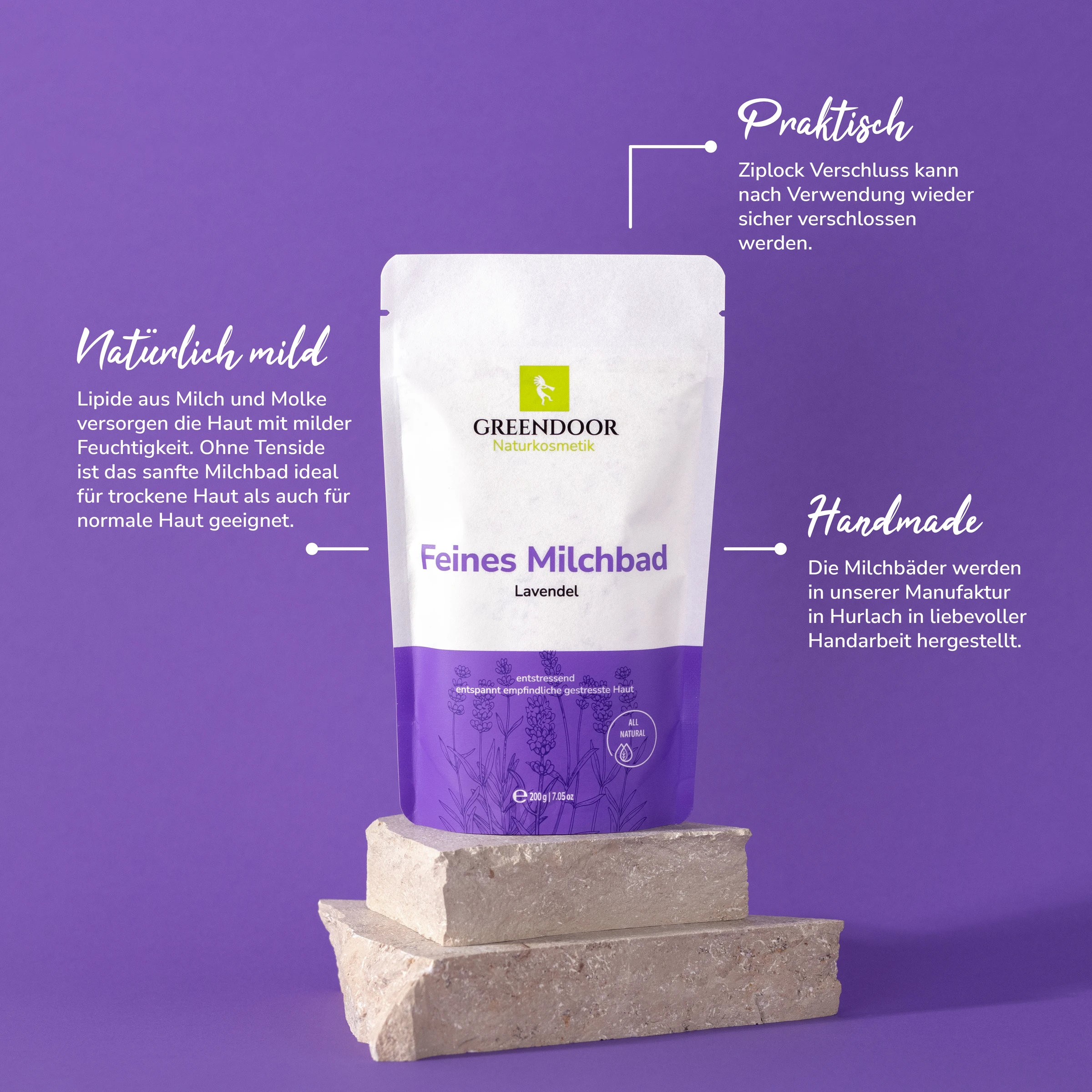 Lavendel aus der Barreme verleiht diesem Greendoor Milchbad den unvergleichlich reinen und zarten Lavendelduft. Milch, Molke und Meersalz pflegen die Haut samtweich. Echte Lavendelblüten aus der Barreme garnieren das Badewasser auf natürliche Weise. Lavendel hat eine beruhigende und entspannende Wirkung. Milch, Molke und französisches Meersalz machen die Haut zart und weich. Das Greendoor Milchbad hat eine enorm ausgleichende Wirkung und sorgt für wirklich natürlich gepflegte samtige Haut. Das Milchbad ist frei von reizenden Tensiden und enthält keine Schaumbildner oder Farbstoffe.