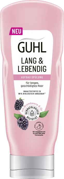 Guhl Lang & Lebendig – silikonfreie Serie für mehr Nachhaltigkeit. Die Serie überzeugt in puncto Nachhaltigkeit auf ganzer Linie. Zum einen wurde bei der Formulierung der Produkte auf Inhaltsstoffe tierischen Ursprungs verzichtet, wodurch die Reihe vegan ist. Zusätzlich haben die Inhaltsstoffe überwiegend einen natürlichen Ursprung und sind nahezu komplett biologisch abbaubar. Der Flaschenkörper ist recycelbar und die Serie wird in Deutschland hergestellt. All dies schont die Umwelt und pflegt gleichzeitig Ihre Haare auf hochwertige Weise.
