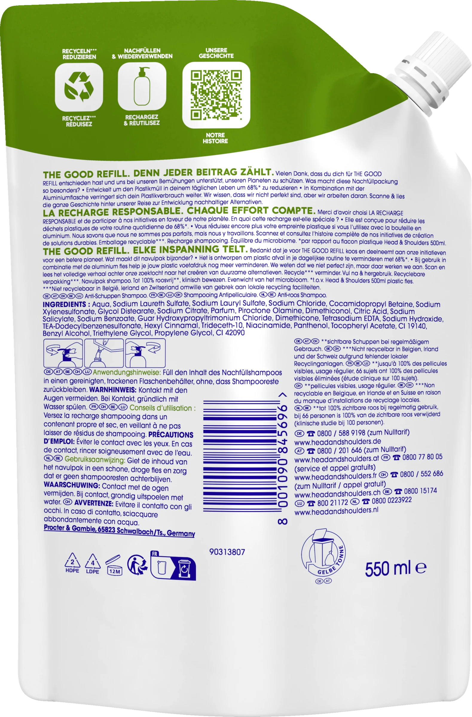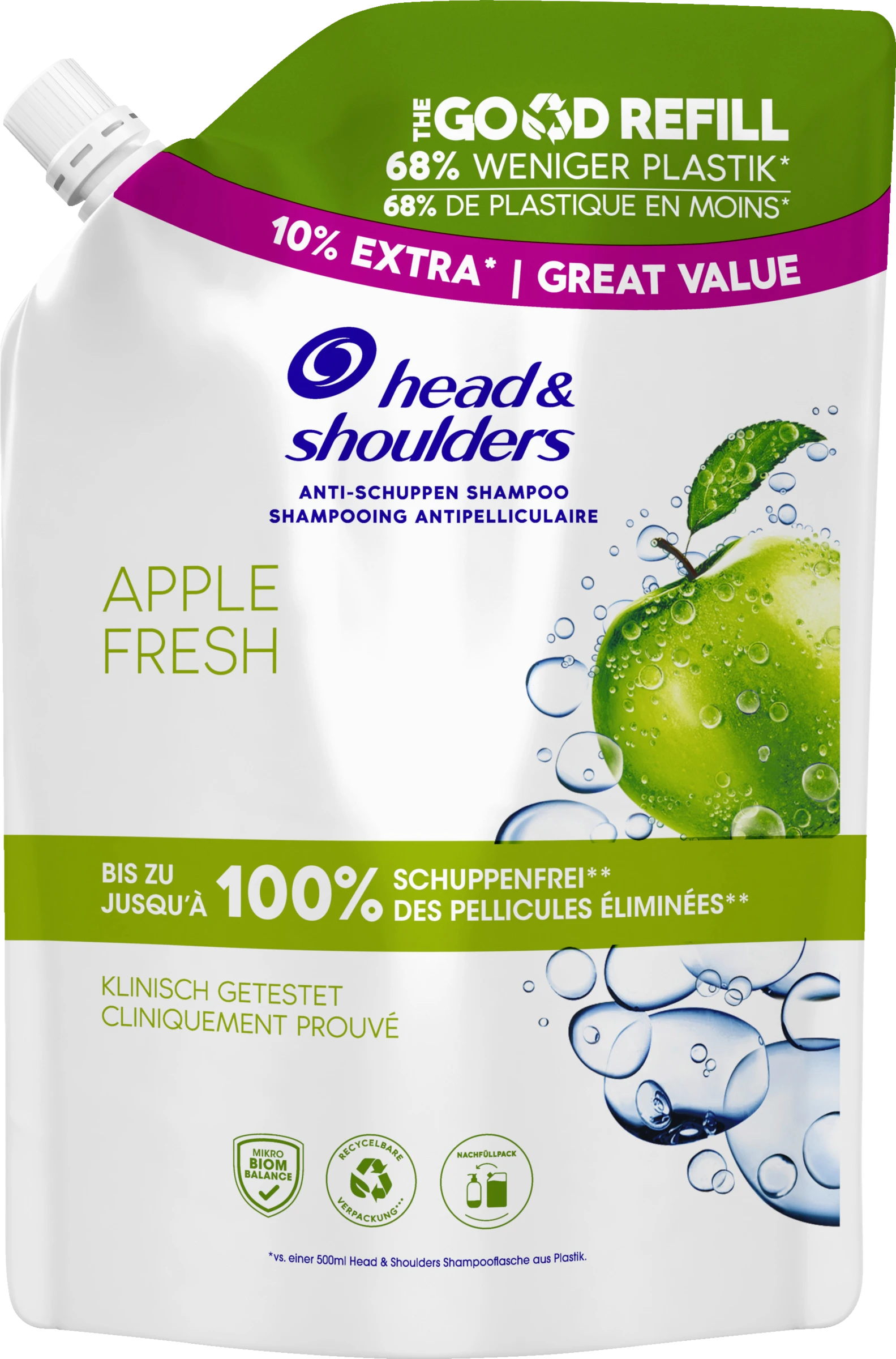 Verabschiede dich von Schuppen* mit Head & Shoulders Apple Fresh Anti-Schuppen Shampoo. Wusstest du, dass wiederkehrende Schuppen ein Zeichen eines unausgeglichenen Mikrobioms der Kopfhaut sind? Mikrobiom ist unser natürliches Selbstschutzsystem. Die regelmäßige Anwendung der Head & Shoulders Formel sorgt für eine ausgewogene Balance des Mikrobioms (unregelmässige Anwendung kann das nicht) und schützt deine Kopfhaut – für bis zu 100% schuppenfreies* Haar. Das Apple Fresh Anti-Schuppen Shampoo reinigt dein Haare gründlich und sorgt dafür, dass es frisch und mit Feuchtigkeit versorgt bleibt. Das Shampoo mit ausgewogenem pH-Wert, Vitaminen und Antioxidantien ist für die tägliche Anwendung geeignet. Dermatologisch getestet und klinisch bestätigt ist die sanfte Wirksamkeit. Dieses Shampoo Nachfüllpack ist recycelbar** und entwickelt um den Plastikmüll in deinem täglichen Leben um 68% zu reduzieren (pro ml vs. deiner 500ml Head & Shoulders Shampooflasche aus Plastik). Zum Nachfüllen, den Shampooinhalt in eine saubere, trockene Flasche füllen. Stelle sicher, dass keine Reste enthalten sind. Du kannst auch deine Head & Shoulders Shampooflasche aus Plastik neu befüllen oder warum versuchst du nicht die nachfüllbare Aluminiumflasche!