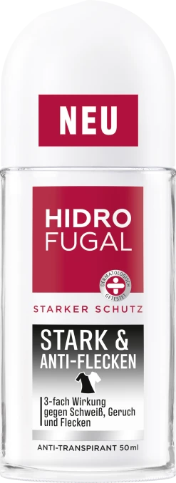 Dreifacher Schutz gegen Schweiß, Geruch und Flecken: Die speziell entwickelte Formel vom Hidrofugal STARK & ANTI-FLECKEN ROLL-ON wirkt zuverlässig gegen Achselnässe und Körpergeruch. Beugt gleichzeitig weißen Rückständen und gelben Flecken auf der Kleidung vor.