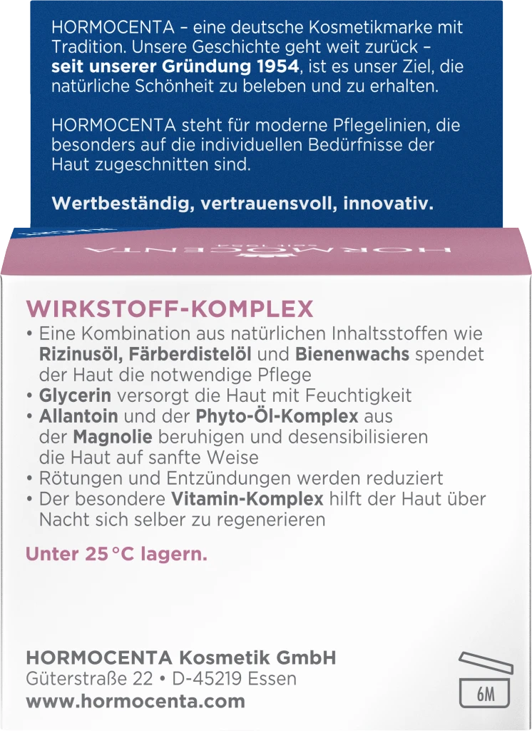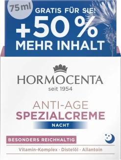 Die HORMOCENTA Spezialcreme Nacht ist eine regenerierende Pflege, die speziell für die Bedürfnisse der trockenen, anspruchsvollen und reiferen Haut entwickelt wurde. Die gehaltvolle Formulierung glättet die Haut spürbar. Der Vitamin-Komplex aus Vitamin A, E und B5 schützt Ihre Haut vor zellschädigenden freien Radikalen und den Folgen vorzeitiger, lichtbedingter Hautalterung. Für einen strahlend schönen, gepflegten Teint. Hautverträglichkeit dermatologisch bestätigt.