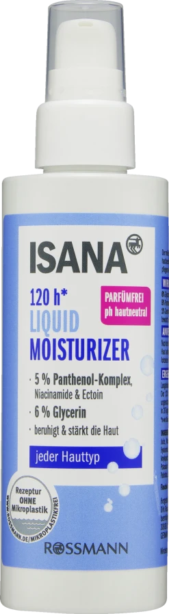 Der milde ISANA 120h* LIQUID MOISTURIZER mit 5% Panthenol-Komplex, Niacinamide & Ectoin wirkt hautberuhigend und stärkt die Hautbarriere. Die Formulierung mit Bio-Aloe Vera Saft ist die perfekte tägliche Feuchtigkeitspflege mit erwiesener Anti-Falten-Wirkung**.WIRKUNG: 6% Glycerin: spendet intensiv Feuchtigkeit und mildert Trockenheitsfältchen. 5% Panthenol-Komplex und Allantoin: Mildern Irritationen und Rötungen. 1% Ceramid-Komplex: unterstützt die Hautschutzbarriere. Bindet und erhöht die Feuchtigkeit der Haut & bewahrt sie vor Austrocknung.ERGEBNIS: Langanhaltend hydratisierte* und sofort glattere Haut**. Der 120 h Hautfeuchtigkeitskomplex enthält eine besondere Kombination aus Amylopectin, aus ungenutztem Reisbruch und Calciumcarbonat, aus nachhaltig angebauter atlantischer Rotalge. So wird in 28 Tagen ein 120 h-Feuchtigkeitsdepot in der Haut geschaffen.**in-vivo Studie zum Wirkstoff, ** in-vivo Studie zur Faltentiefenreduktion bei 80% der Testerinnen nach 1 hDiese Rezeptur ist zu 100% ohne Mikroplastik.