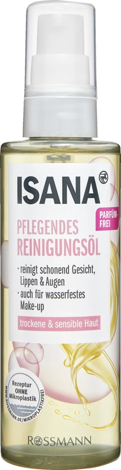 Das ISANA PFLEGENDE REINIGUNGSÖL mit wertvollem Mandelöl entfernt schonend auch wasserfestes Make-up und versorgt die Haut bereits bei der Reinigung mit Feuchtigkeit., Die zarte Formulierung mit Pflegekomplex reinigt die Haut sanft und gründlich von Verschmutzungen – ohne nach der Reinigung einen öligen Film auf der Haut zu hinterlassen.