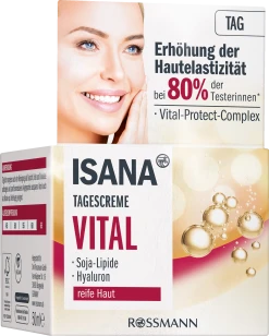 Die ISANA VITAL TAGESCREME mit einem Vital-Protect-Complex aus wertvollen Lipiden, Feuchtigkeitsspendern und einem Wirkstoff aus der Mattenbohne ist eine festigende Pflege, die die Haut gezielt vitalisiert und pflegt.Wirkung: Der Wirkstoff aus der Mattenbohne stimuliert die epidermale Hauterneuerung*** und regt die Collagensynthese an****. Hyaluronsäure, Arganöl und Sheabutter unterstützen die Feuchtigkeits- und Lipidbalance. Vitamin E und Lichtschutzfaktor 15 schützen Ihre Haut vor vorzeitiger, lichtbedingter Hautalterung. Ergebnis: Die ISANA VITAL TAGESCREME verleiht der Haut mehr Spannkraft** – für straffere Gesichtskonturen.* Bei 92% der Testerinnen wurde nach 4 Wochen ein positiver Effekt hinsichtlich der Hautelastizität nachgewiesen. ** in-vivo Studie zur Hautfestigkeit/-elastizität, an 20 Probanden 4 Wochen, Anwendung einmal täglich *** in-vivo Studie Wirkstoff Mattenbohne **** in-vitro Studie Wirkstoff MattenbohneHautverträglichkeit: dermatologisch bestätigt.Diese Rezeptur ist zu 100% ohne Mikroplastik.