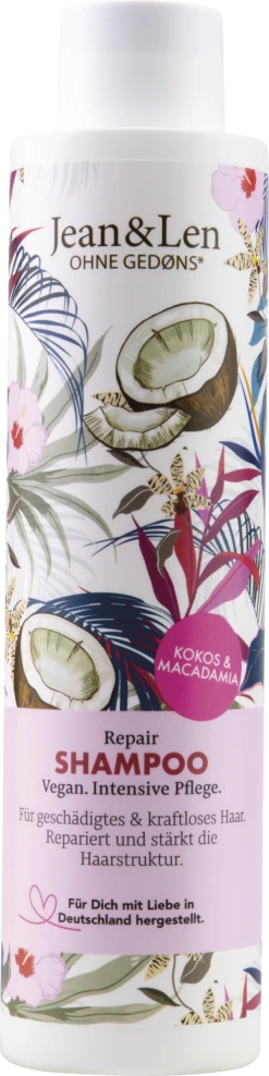 Das reparierende Shampoo schützt und pflegt geschädigtes und kraftloses Haar. Die vegane Rezeptur mit Kokosnussöl und Macadamiasamenextrakt hilft, Haarbruch zu reduzieren und beugt Feuchtigkeitsverlust vor. Es ersetzt aber nicht die zwei Liter Wasser am Tag, also schön weiter genug trinken. Durch Hitze und Styling geschädigtes Haar wird in der Tiefe wiederaufgebaut. Das Repair-Shampoo riecht sanft nach Kokos – wie ein Strandtag unter Palmen. Das vegane Shampoo ohne Silikone und ohne Parabene sorgt für gesund aussehendes, starkes und glänzendes Haar.
