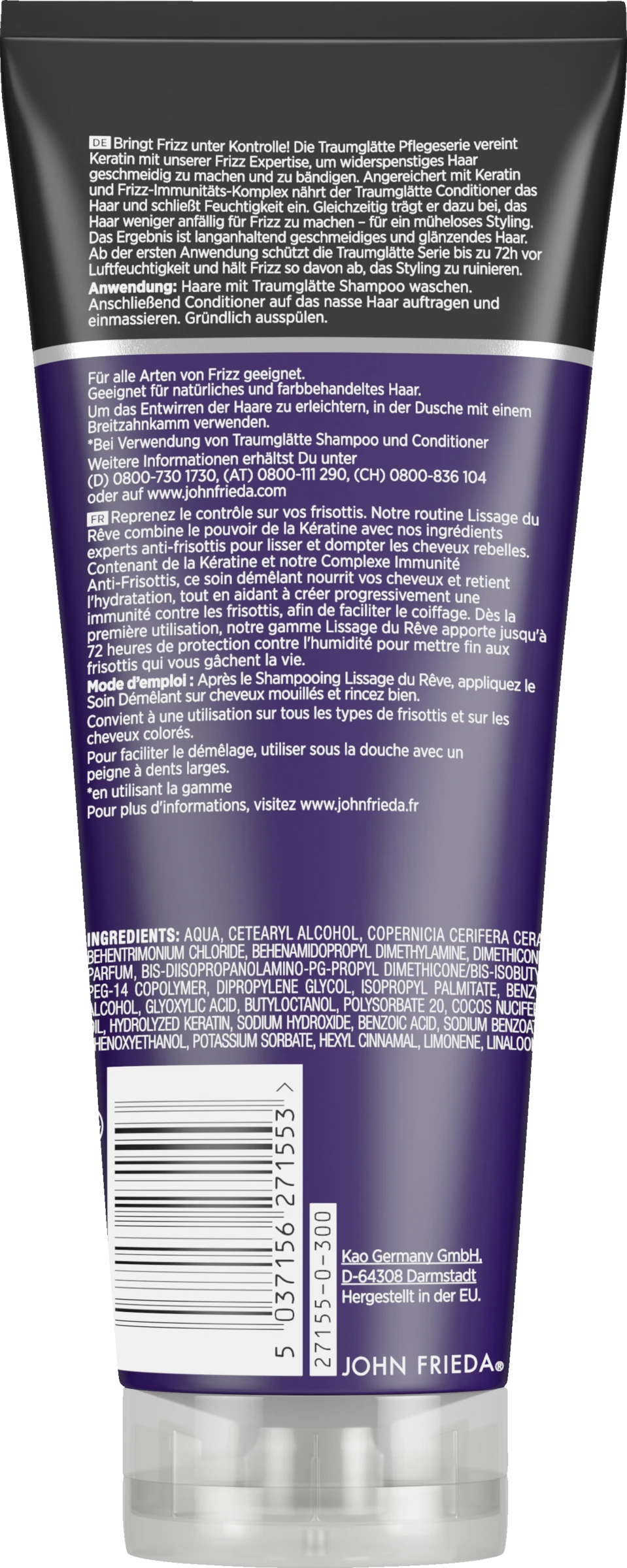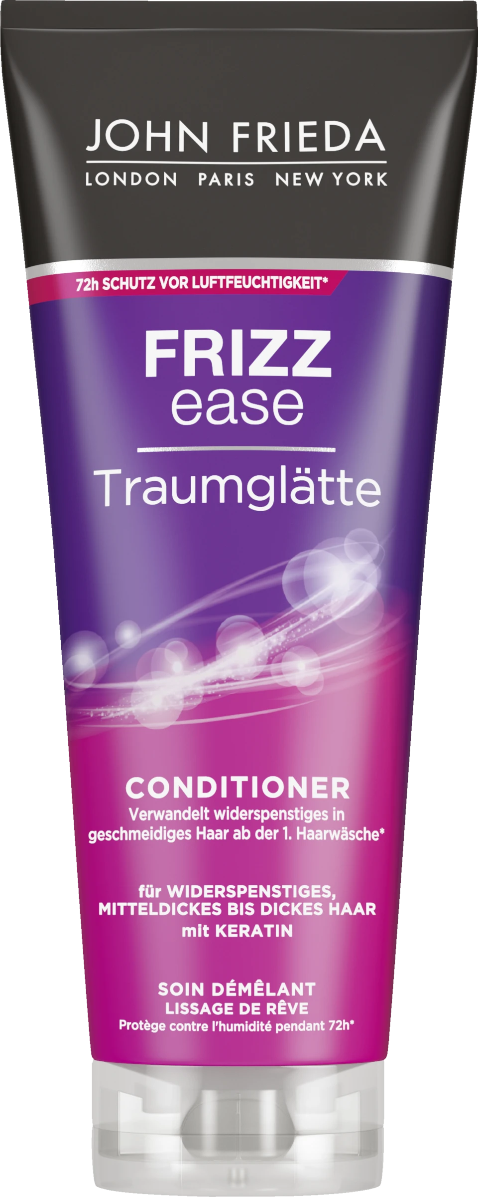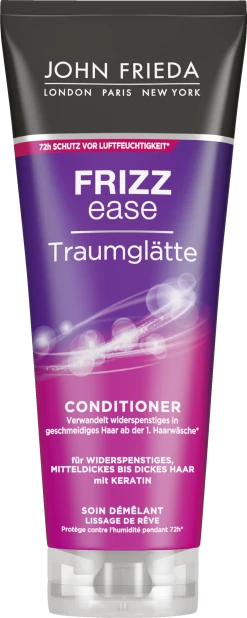 Bringt Frizz unter Kontrolle! Die Traumglätte Pflegeserie vereint Keratin mit unserer Frizz Expertise, um widerspenstiges Haar geschmeidig zu machen und zu bändigen. Angereichert mit Keratin und Frizz-Immunitäts-Komplex nährt der Traumglätte Conditioner das Haar und schließt Feuchtigkeit ein. Gleichzeitig trägt er dazu bei, das Haar weniger anfällig für Frizz zu machen – für ein müheloses Styling. Das Ergebnis ist langanhaltend geschmeidiges und glänzendes Haar. Ab der ersten Anwendung schützt die Traumglätte Serie bis zu 72 h vor Luftfeuchtigkeit und hält Frizz so davon ab, das Styling zu ruinieren.