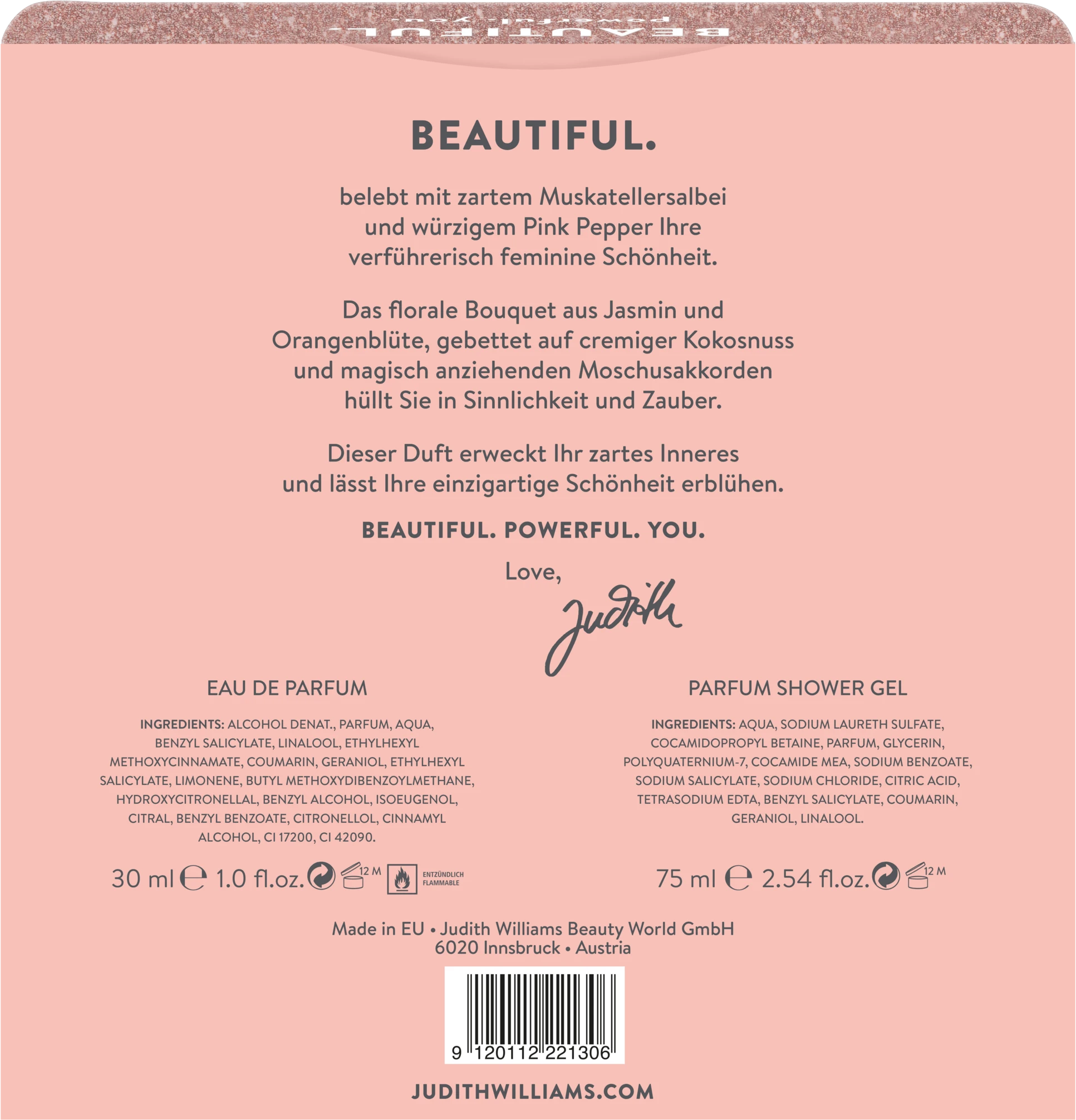 Dieses Geschenkset bietet das komplette Beautiful Dufterlebnis.Zarter Muskatellersalbei und würziger Pink Pepper beleben Ihre verführerisch feminine Schönheit. Ein florales Bouquet aus Jasmin und Orangenblüte, gebettet auf cremiger Kokosnuss und magisch anziehenden Moschusakkorden hüllt Sie in Sinnlichkeit und Zauber. Beautiful erweckt Ihr zartes Inneres und lässt Ihre einzigartige Schönheit erblühen. Das Set beinhaltet: Eau de Parfum 30 ml und Shower Gel 75 ml.