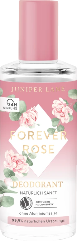 Juniper Lane Deodorants sind 99,9% natürlichen Ursprungs und schützen langanhaltend und sicher vor unangenehmer Geruchsbildung – ohne Zusatz von Aluminiumsalzen. Die 24h wirksame Rezeptur mit Bio-Aloe Vera Saft pflegt die Haut sanft und hinterlässt keine weißen Deospuren. Der floral-pudrige Duft von Juniper Lane Forever Rose liebkost dabei die Haut mit lieblichen Noten von Rose, Iris und Patchouli.