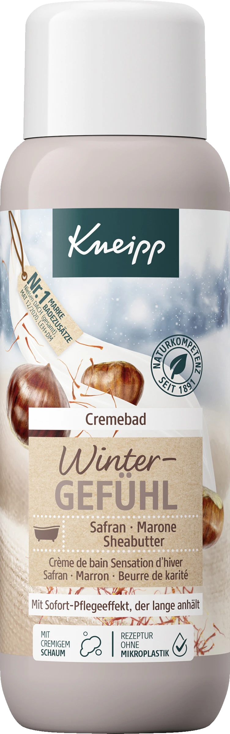 Genieße Wohlfühlmomente mit dem Kneipp® Cremebad Wintergefühl. Mit Safran- und Maronenextrakt sowie natürlicher pflegender Sheabutter bewahrt das Bad die Feuchtigkeit der Haut und schenkt ein kuschelweiches Hautgefühl. Der warm-pflegende Duft und der cremige Schaum machen das Bad zu einem entspannenden Wohlfühlerlebnis für die Sinne, während die Haut mild gereinigt und sanft gepflegt wird, ohne sie auszutrocknen.