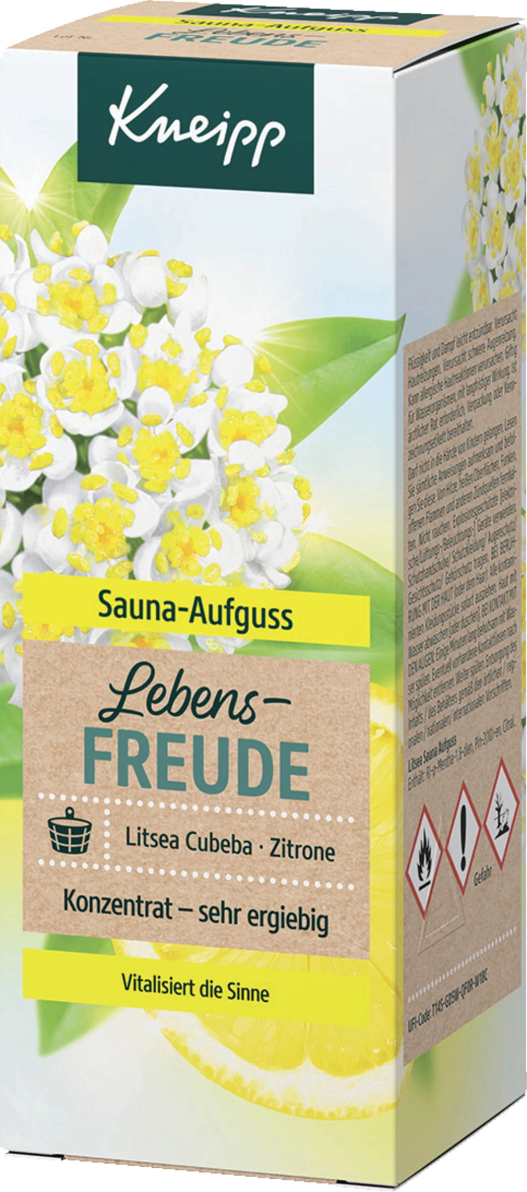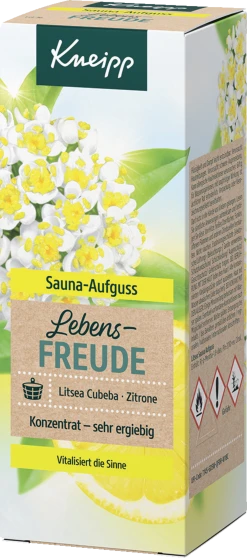Der belebende Kneipp® Sauna-Aufguss Lebensfreude aktiviert Körper und Geist an tristen Tagen. Die natürlichen ätherischen Öle der Litsea Cubeba und der Zitrone verbreiten einen frischen, heiteren Duft. Aufgrund der wohltuenden Wirkung bietet der Kneipp® Sauna-Aufguss eine wirkungsvolle Ergänzung regelmäßiger Saunagänge. Regelmäßige Saunagänge fördern das allgemeine Wohlbefinden, die Widerstandskraft des Körpers und unterstützen die Hautdurchblutung. Der Baum der Litsea Cubeba hat zitronenartige duftende Blätter und Blüten. Der Duft der daraus gewonnenen ätherischen Öle wirkt erfrischend und stimulierend. Zitrone erfrischt Körper und Geist, ihr Duft wirkt aufmunternd und aktivierend.