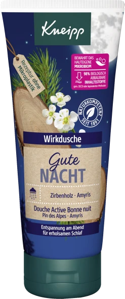 Dein Kneipp® Moment, der Dir Ruhe und Entspannung für eine erholsame Nacht schenkt. Genieße Dein Abendritual mit der Kneipp® Wirkdusche Gute Nacht und bereite Dich so auf erholsamen Schlaf vor. Eine warme Dusche und der beruhigende, warm-holzige Duft mit ätherischen Ölen aus Zirbenholz und Amyris schenken Entspannung für eine erholsame Nacht. Gute Nacht – besserer Morgen!