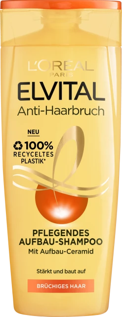 L’Oreal Paris Elvital Anti-Haarbruch Pflegendes Aufbau-Shampoo:Der Pflege-Experte mit maßgeschneiderten Lösungen für jeden Haartyp. Die Besonderheiten von trockenem, strapaziertem oder brüchigem Haar:Ihr von Natur aus trockenes Haar wird durch Föhnen und Bürsten zusätzlich strapaziert. Es ist spröde, brüchig und glanzlos. Das Kraft von Aufbau-Ceramid für gestärktes, geschmeidiges HaarDie Formel mit AUFBAU-CERAMID wirkt gezielt an den strapazierten Stellen:stärkt und baut auf: Dringt tief ein, um die Haarstruktur zu kräftigen.Geschmeidigkeit und Glanz: Füllt raue und brüchige Stellen auf und glättet die Haaroberfläche.