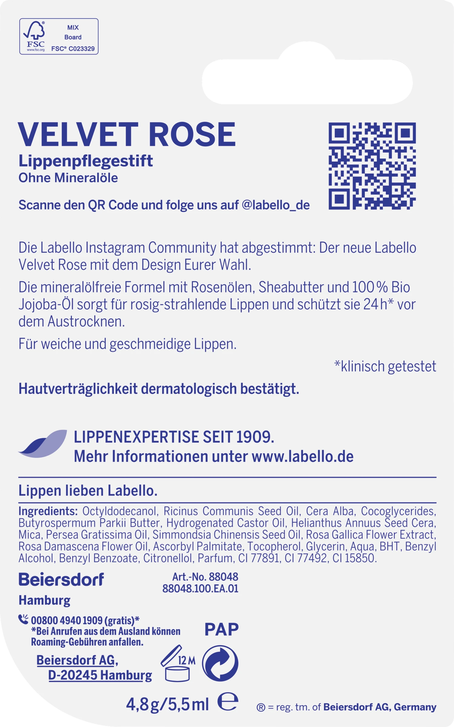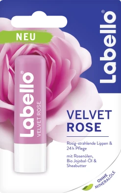 Erlebe die zarte Pflege von Labello Velvet Rose. Die Formel mit Rosenölen, Sheabutter und 100% Bio Jojoba-Öl sorgt für rosig-strahlende Lippen und schützt sie 24h* vor dem Austrocknen – ganz ohne Mineralöle. Der Lippenpflegestift verleiht deinen Lippen ein zartrosa Finish und überzeugt durch seinen dezenten Rosenduft. Für natürlich aussehende und spürbar geschmeidige Lippen – den ganzen Tag.