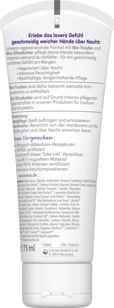 Erlebe das lavera Gefühl geschmeidig weicher Hände über Nacht: Während wir schlafen, arbeiten unsere Hautzellen auf Hochtouren, um die Spuren des Tages zu reparieren. Die regenerierende Formel mit Bio-Traube und Bio-Sheabutter pflegt deine Hände besonders intensiv während du schläfst.