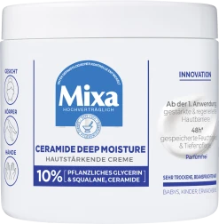 Entdecken Sie die neue hautstärkende Creme Ceramide Deeo Moisture, die mit ihrer schnell einziehenden und nicht fettenden Textur die Haut sanft umhüllt.Die Ceramide Deep Moisture Hautstärkende Creme von Mixa pflegt sehr trockene und beanspruchte Haut am Körper, im Gesicht sowie an den Händen. Die Creme für Babys, Kinder und Erwachsene ist eine hochkonzentrierte und hochverträgliche Pflege, welche Feuchtigkeit speichert und die natürliche Hautbarriere schützt. Dafür enthält sie 10 % pflanzliches Glycerin, Squalane und Ceramide, die regenerierend wirken und die Haut tiefenwirksam mit Feuchtigkeit versorgen. Die schnell einziehende und nicht fettende Textur schützt vor dem Austrocknen und umhüllt die Haut sanft – für ein geschmeidiges und wohltuendes Gefühl bereits nach der ersten Anwendung.