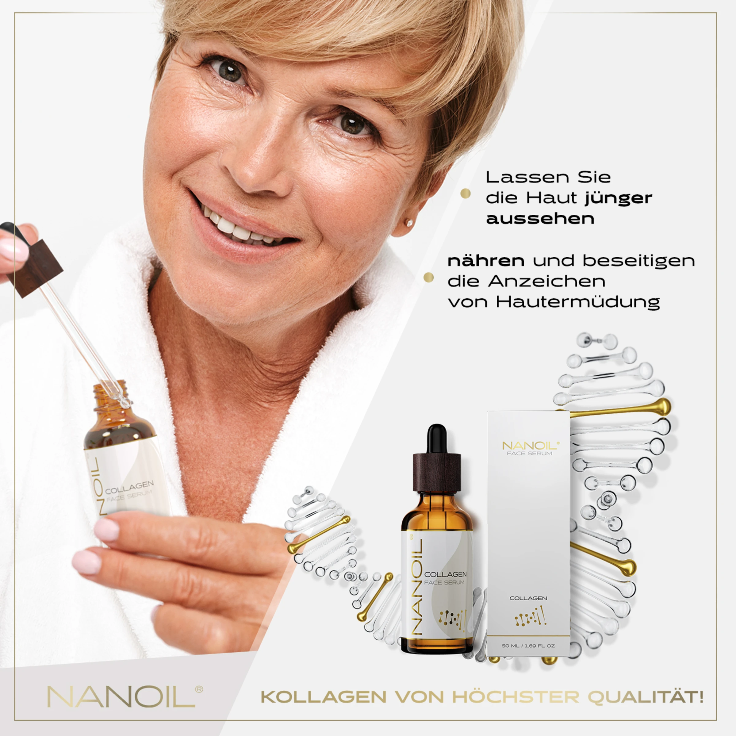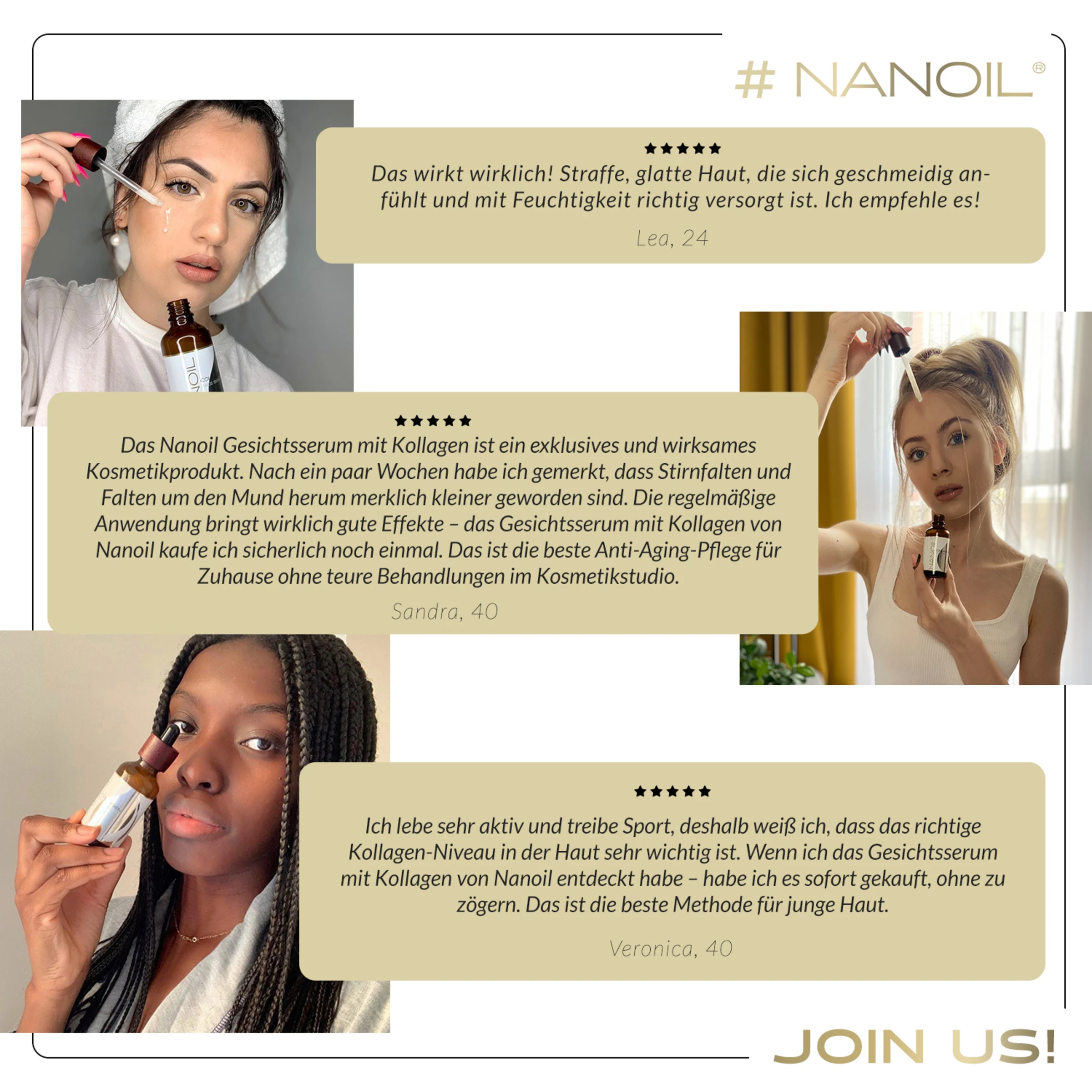Tragen Sie das Gesichtsserum von Nanoil auf die gereinigte, trockene Gesichts-, Hals- und Dekolletéhaut auf. Massieren Sie das Produkt mit den Fingerspitzen ein, sparen Sie dabei die Augenpartie aus. Lassen Sie das Serum einziehen und tragen Sie dann Ihre Lieblingscreme oder ein Gesichtsöl auf. Verwenden Sie es morgens und/oder abends.