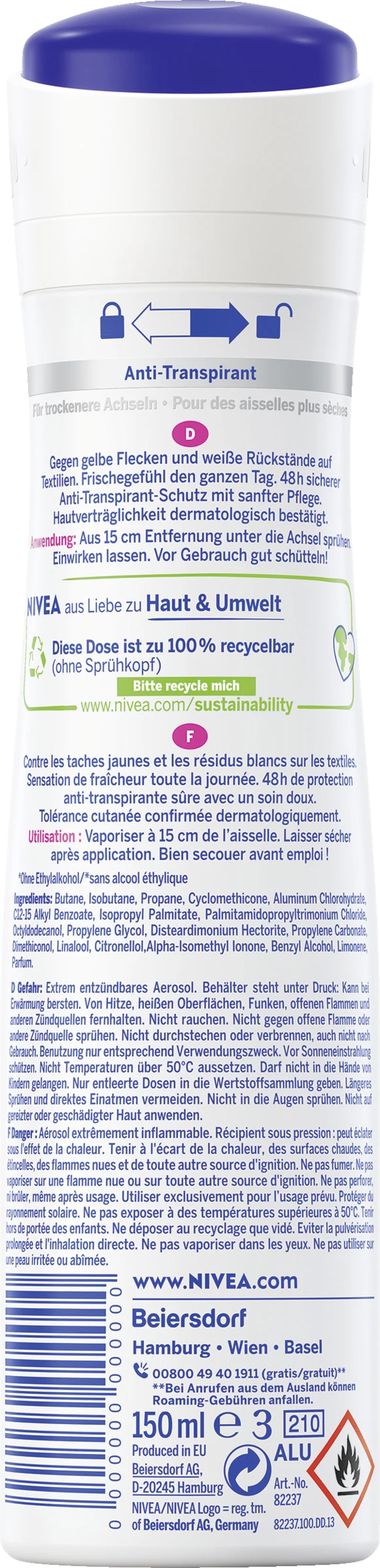 Extrem entzündbares Aerosol. Behälter steht unter Druck: Kann bei Erwärmung bersten. Von Hitze, heißen Oberflächen, Funken, offenen Flammen und anderen Zündquellen fernhalten. Nicht rauchen. Nicht gegen offene Flamme oder andere Zündquelle sprühen. Nicht in die Augen sprühen. Nicht auf gereizter oder geschädigter Haut anwenden. Nicht durchstechen oder verbrennen, auch nicht nach Gebrauch. Benutzung nur entsprechend Verwendungszweck. Vor Sonnenbestrahlung schützen. Nicht Temperaturen über 50°C aussetzen. Darf nicht in die Hände von Kindern gelangen. Nur entleerte Dosen in die Wertstoffsammlung geben.