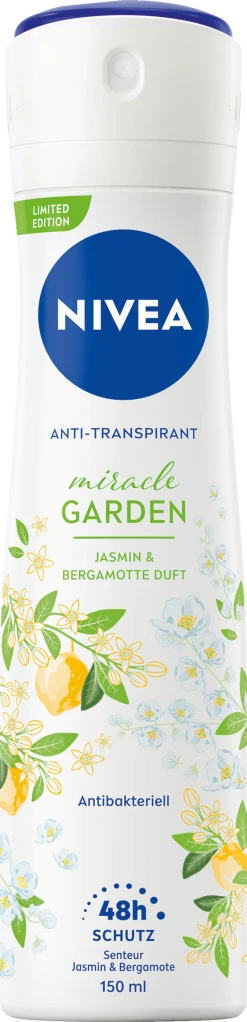 Das NIVEA Miracle Garden Jasmin Deo Spray bietet dir effektiven, langanhaltenden Anti-Transpirant-Schutz und wirkt antibakteriell. Das Limited Edition Deo duftet nach Jasmin und Bergamotte und die frische Formel sorgt für ein gepflegtes und trockenes Hautgefühl. Die Hautverträglichkeit ist dermatologisch bestätigt. Nimm dir einen Moment für dich selbst: NIVEA Miracle Garden Jasmin Deo Spray.