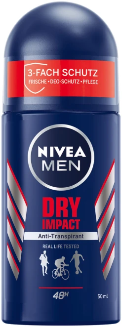 NIVEA MEN Dry Impact Deodorant Roller bietet zuverlässigen Anti-Transpirant-Schutz – 48 Stunden lang. Die hocheffektive Dual-Active-Formel mit zwei besonders wirksamen Anti-Transpirant-Inhaltsstoffen wirkt effektiv gegen Achselnässe, hält die Achseln angenehm trocken und verhindert so unangenehmen Körpergeruch. Der Roller bietet einen maskulinen, frischen Duft und pflegt die Haut.