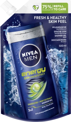Jeden Tag mit neuer Energie starten: Die NIVEA MEN Energy Pflegedusche im praktischen Nachfüllbeutel mit revitalisierendem Minzextrakt und frischem, maskulinem Duft verleiht der Haut das Gefühl von intensiver Pflege und langanhaltender Frische. Das Duschgel ist pH-hautneutral und die Hautverträglichkeit ist dermatologisch bestätigt.Haut und Haar fühlen sich revitalisiert und gepflegt an: NIVEA MEN Energy Pflegedusche.