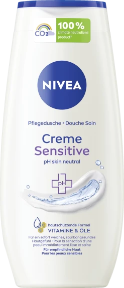 Entdecken Sie die NIVEA Creme Sensitive Pflegedusche für empfindliche Haut. Spüren Sie, wie die seifenfreie Cremedusche mit Kamillen-Extrakt, Vitamin C & E und wertvollem Ölen Ihre Haut sanft reinigt und pflegt. Genießen Sie den samtweichen Schaum und den milden Duft. Die sanfte Pflegeformel wirkt außerdem im Gleichgewicht mit dem hauteigenen Mikrobiom. Dieses Duschgel ist zu 100% klimaneutralisiert und tut damit sowohl Ihrer Haut als auch der Umwelt etwas Gutes. Die Formel ohne Mikroplastik ist zu 99% biologisch abbaubar und zusätzlich besteht die Flasche aus 97% Recycling-Material. Für ein natürliche reines und gesundes Hautgefühl: NIVEA Creme Sensitive Pflegedusche.