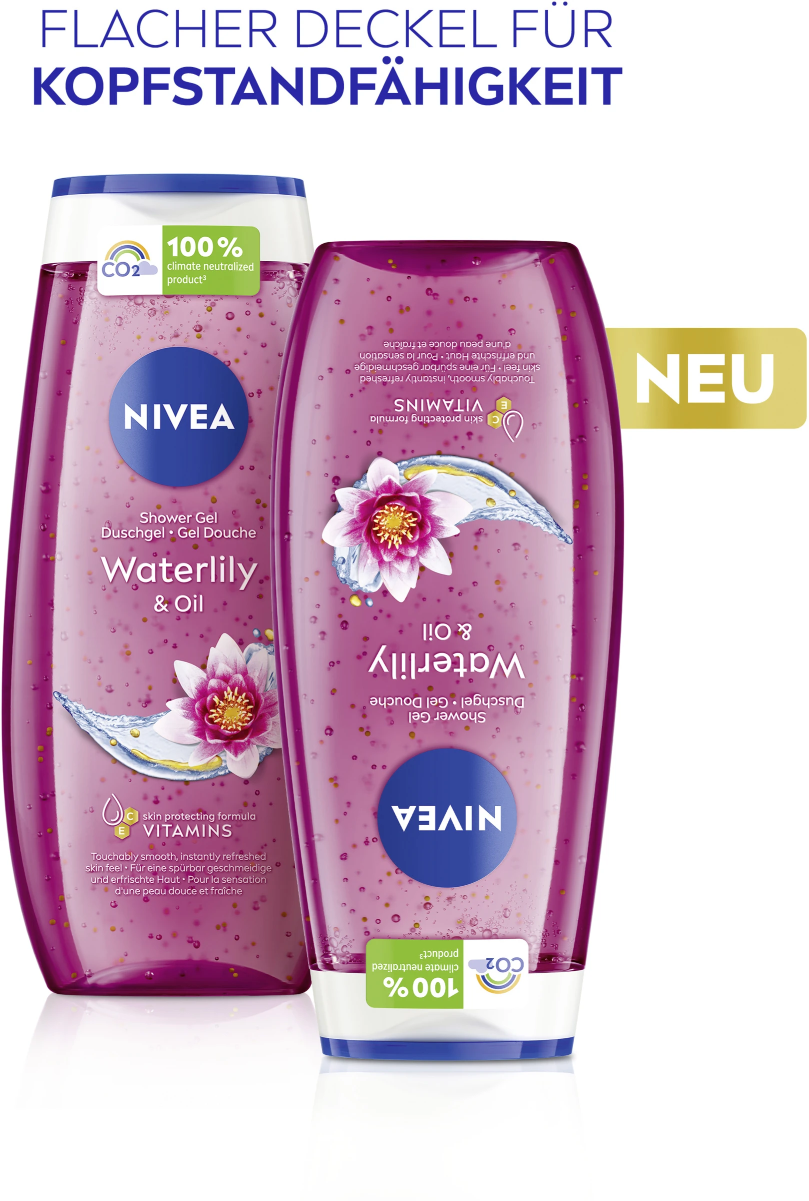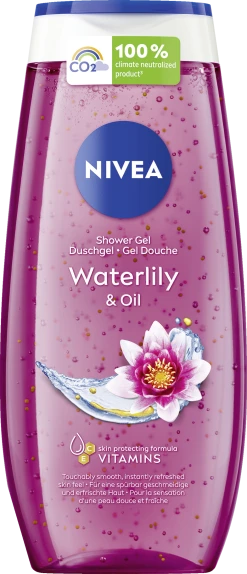 Erleben Sie ein geschmeidiges Hautgefühl mit der NIVEA Waterlily & Oil Pflegedusche. Spüren Sie, wie das erfrischende Duschgel mit Pflegeöl-Perlen, Vitamin C & E und wertvollen Ölen Ihre Haut sanft reinigt und pflegt. Der frische Duft nach Wasserlilie verwöhnt Ihre Sinne unter der Dusche. Dieses Duschgel ist zu 100% klimaneutralisiert und tut damit sowohl Ihrer Haut als auch der Umwelt etwas Gutes: Die Formel enthält kein Mikroplastik und ist zu 99% biologisch abbaubar. Die Verpackung besteht zu 96% aus Recycling-Material, abgesehen von der Verschlusskappe und Label. Verwandeln Sie jedes Duscherlebnis in einen verwöhnenden Pflegemoment mit NIVEA: Waterlily & Oil Pflegedusche.