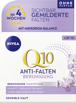 Die Q10 POWER ANTI-FALTEN + STRAFFUNG Tagespflege für sensible Haut mit 100% HAUTIDENTISCHEM Q10 mildert Falten sichtbar. Die sanfte Formel ist speziell für die Bedürfnisse sensibler Haut entwickelt und frei von Parfum und Ethyl Alkohol: Q10 POWER Anti-Falten + Beruhigung Tagespflege Sensitiv.